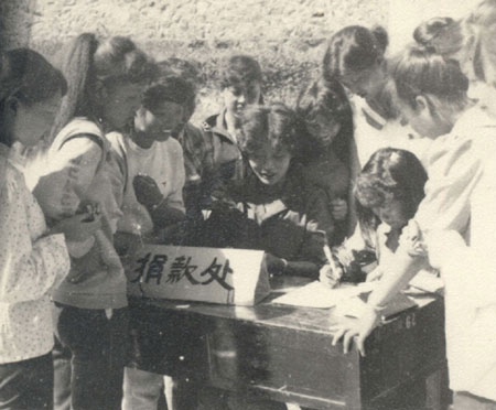 每当群众遇到困难,女子连民兵总是尽力相助,排忧解难。图为1990年5月民兵们踊跃为北沙乡困难户捐款。